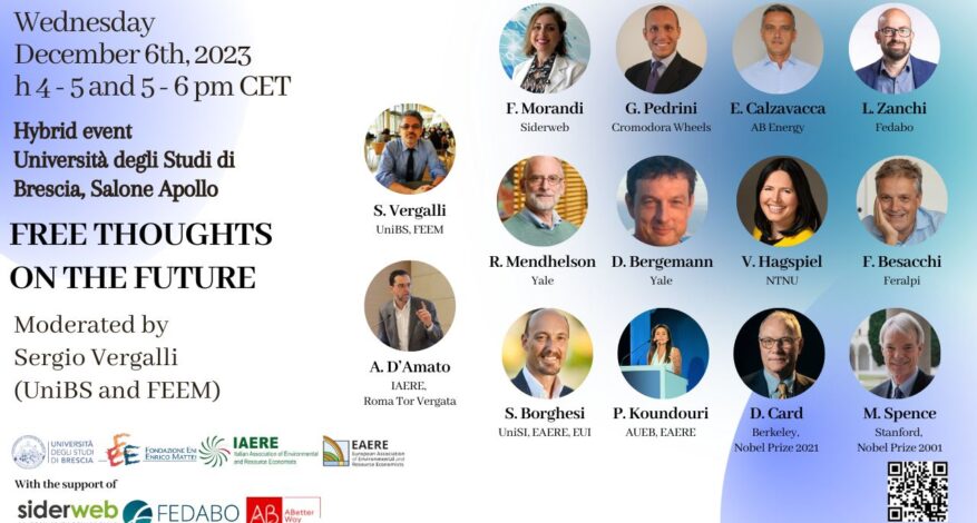 In the context of the EAERE Webinars on Science-Policy-Business Interface, on the 21st of July, 2022, University of Brescia and Fondazione Eni Enrico Mattei will host the event “Free thoughts on the future”. A double panel of international speakers from academia and businesses will discuss their expectations and hopes on the future evolution of the economy, ranging from issues related to sustainability, energy transition and environmental and climate policies, with the aim to unify their visions in common actions and possible solutions. The event will be moderated by Professor Sergio Vergalli (University of Brescia and Fondazione Eni Enrico Mattei).